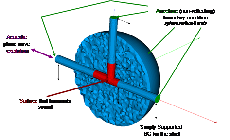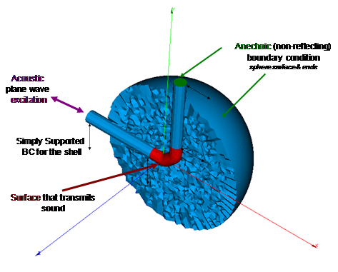 • A plane acoustic wave is used as a sound source. This wave source creates vibration in the FE model of the pipe structure.