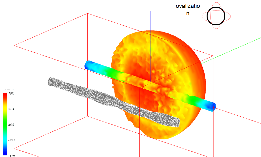 Figure 3. Example of detailed analysis at a frequency where the pipe transmits sound and pulsation drives pipe wall vibration. In this case, we find the pipe cross section to bend into a so called ovalisation mode. (Click figure to expand)