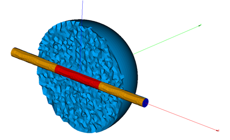 • A small section of the pipe (shown in red in the figures) is coupled to an anechoic acoustic external section. The vibration of the pipe shell is allowed to radiate to the exterior on the red coupling surface and the net radiated acoustic sound power is calculated on the sphere’s surface.