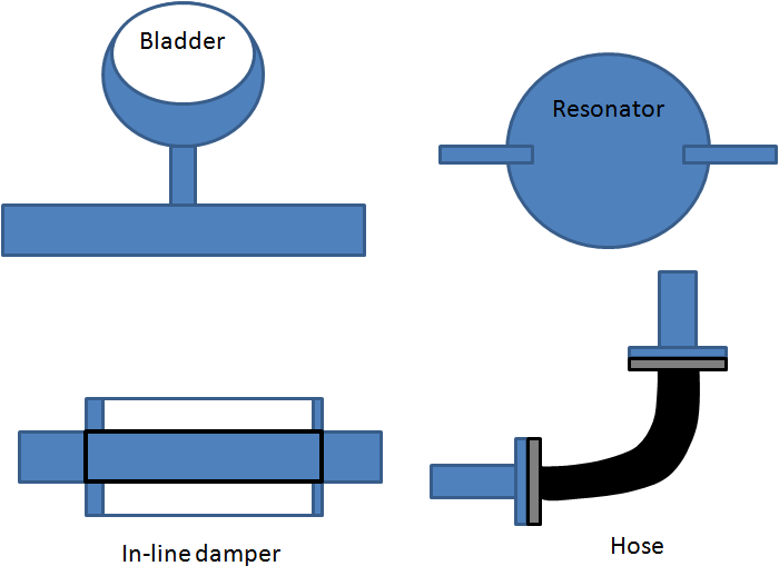In-line dampers tend to work for lower Line Pressure and are usually applied on a reciprocating pump’s charge side. Bladders can be used on both the suction and charge sides.