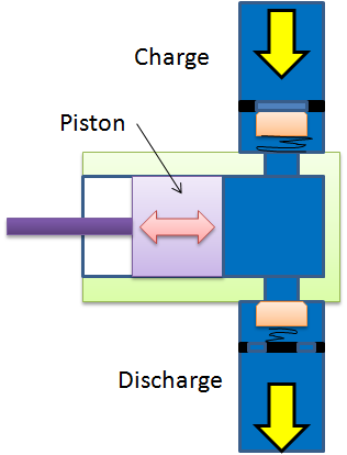 Reciprocating pumps use a reciprocating piston to displace fluid volume. Inlet flow is controlled by a passive valve, i.e. a springloaded valve that opens when the piston expands the cylinder’s volume (see Figure 1). The discharge valve is closed during the suction stroke. The discharge valve is opened when the piston decreases the cylinder’s volume.The suction valve is closed during this compression stroke.