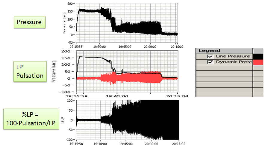 Figure 2. Triplex pumps operating without pulsation countermeasure on the discharge side can be seen to cause strong pulsation. We see that pulsation tends to be stronger in conditions where LP is dropping. In the example, this is due to the pump system’s increased flow rate. (Click figure to expand)