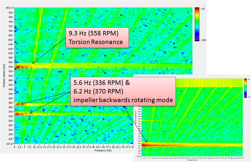 Figure 6. Speed up of flue gas fan with variable speed drive where an optical tacho serves as the reference. The presence of three critical speeds can be seen in the A) Amplitude-RPM-Frequency map and in B) the order FRFs. The critical speed at ~560 RPM is a torsion resonance, while the two other critical speeds are caused by backward rotating modes. (Click on picture to enlarge)