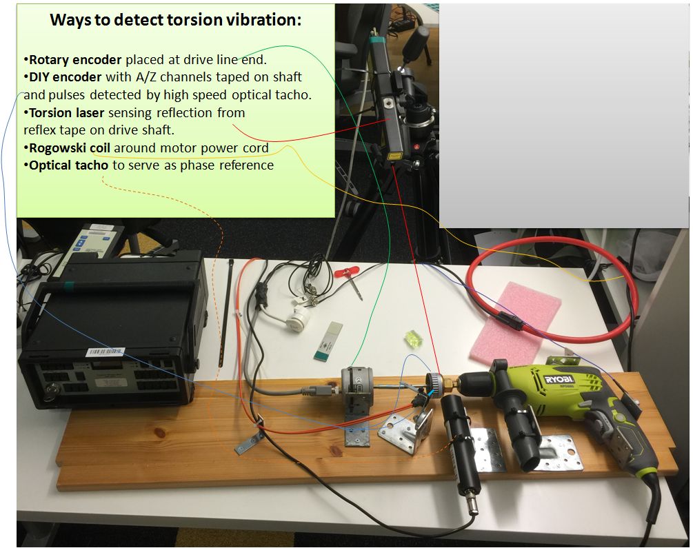 Figure 2. Use of one or more rotary encoder to detect torsion vibration. The encoder is placed at the free end. Note – in this example, the encoder is deliberately connected via a flexible shaft to cause a torsion resonance. A DIY encoder taped onto the rotating shaft can be used as well. Adjacent to the DIY encoder is also a small strip of reflex tape for use with a torsion laser. The use of DIY encoder strips and one or more TTL laser tacho switches allows both the AC and DC components of torque to be determined. Fixtures to keep the laser tacho aligned with the encoder strip are necessary for an accurate measurement. The errors in the encoder strip pattern can be compensated for by software. (Click on picture to enlarge)