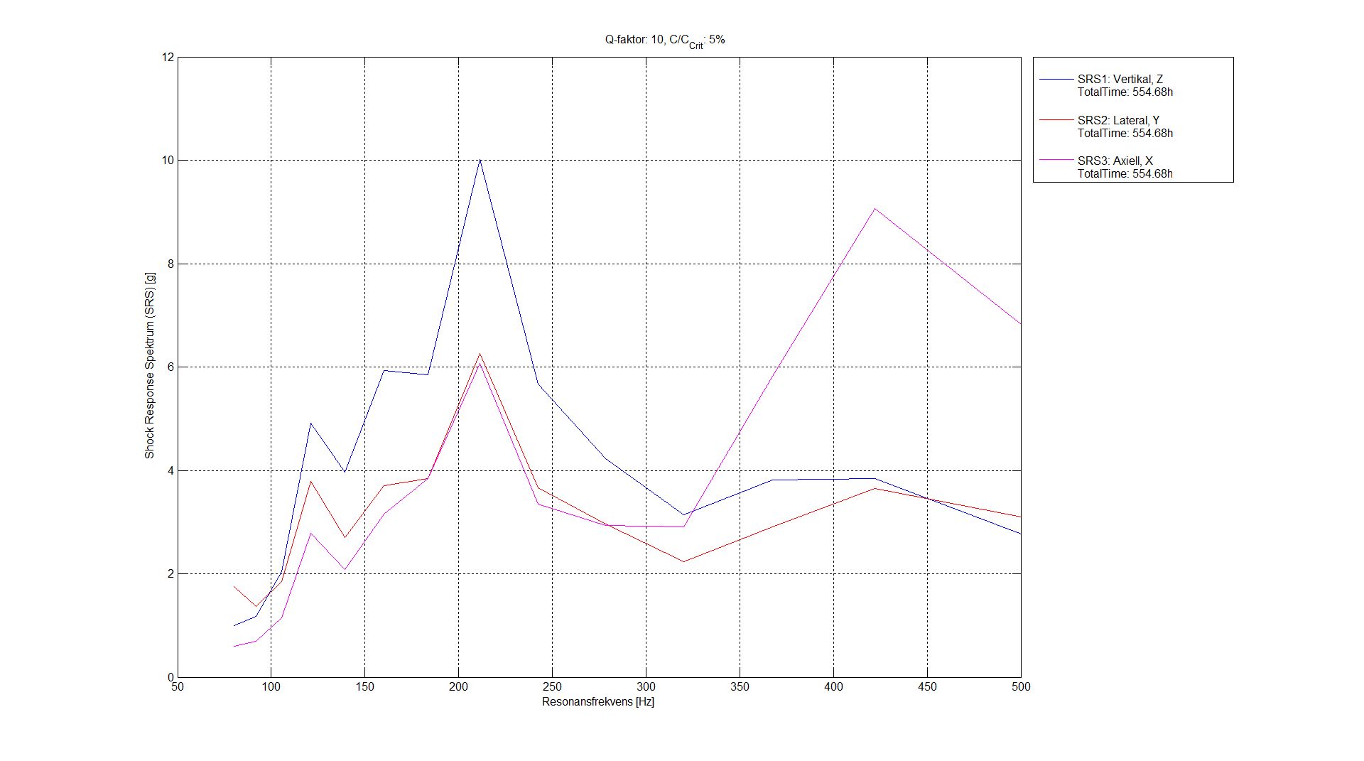 The resonance frequency and Q-factor refer to that of the SDOF system the time signal is convoluted with and the SRS/RS amplitude refers to the maximum amplitude of the SDOF response. Note that a single SRS value is the result of a long time series being convoluted with a specific SDOF resonance frequency and Q-factor combination, i.e. the SRS is a very strong data reduction technique as can be seen in Figure 5(C).